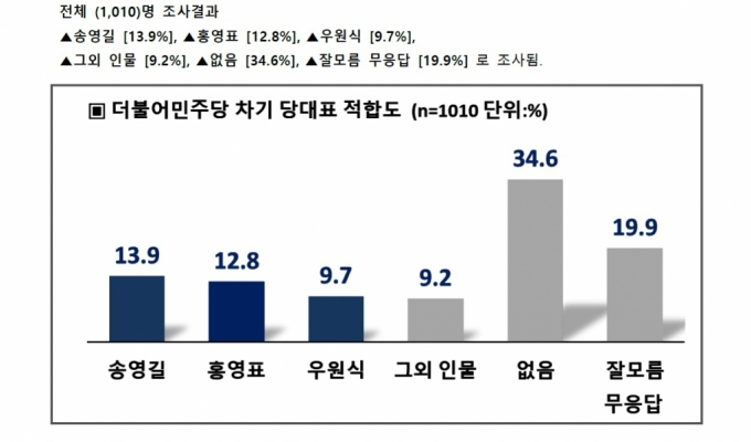 ■ 이동형의 촉 ■ 국민의힘 당 대표 지지율, 촉으로 분석하다 # 후보난립 국민의힘 전당대회 '컷오프' # 文, '임·박·노' 강행 명분 쌓기…당청 갈등 신호탄? 국민의힘 당권 주자인 이준석(오른쪽부터), 조경태, 나경원, 주호영, 홍문표 후보가 지난 8일 서울 이준석 국민의힘 당 대표 후보가 지지도 조사에서 여전히 선두를 유지하고 있는 것으로 조사됐다. 헤럴드경제=이명수 기자 최근 '당대표 지지율' 여론조사에서 연속 1위를 하면서 크게 주목받고 있는 이준석 전 국민의힘 최고위원의 서울대 강연이 철통 보안 속에. 2020년 2월 17일, 자유한국당과 새로운보수당 및 미래를향한전진4.0 등의 정당들이 통합하여 '미래통합당'이라는 당명으로 창당되었다. 국민의힘 차기 당대표 지지율…나경원 15.9%로 1위 달려.